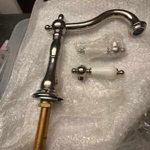 Stunning Kingston Brass widespread bathroom faucet in polished nickel. White ceramic handles. Comes with spout, white ceramic handles, drain, drain assembly, and valves. I have four available. Price is for one.