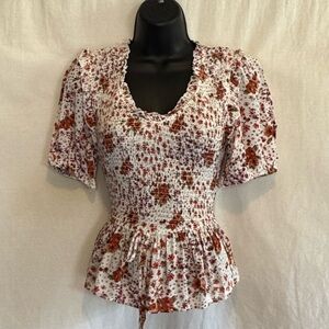 Chic smocked blouse with floral pattern. Features puff sleeves and ruffled neckline. Perfect for casual outings.