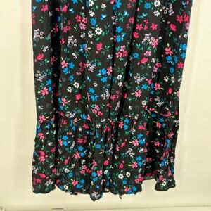 100% rayon woven fabric - black with pink, blue, green, and white floral print - tag recommends hand wash