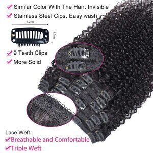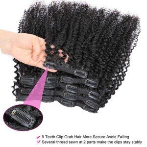 Curly Hair Extensions Clip In Human Hair, Premium quality 9 tooth steel clips with silicone lined.These clips help keep these curly extensions in place and harmless to your natural hair.The clips are sewn in securely and all of them function properly.