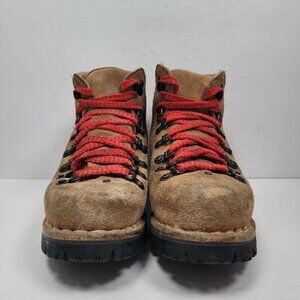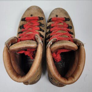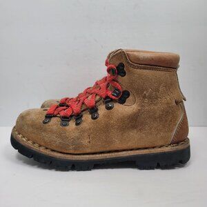 These vintage hiking boots feature durable suede leather and striking red laces, offering both style and functionality. Designed for rugged outdoor adventures.