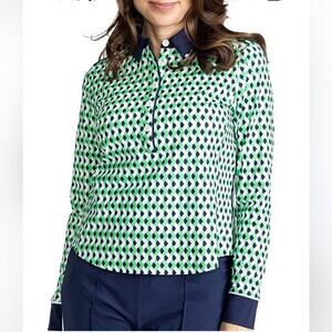 Kinona At the Pin chevron print golf top green blue collared long sleeve large