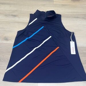 Straight drive sleeveless golf top, navy blue mock neck zips in the back asymmetrical stripes in the front very nice quality.