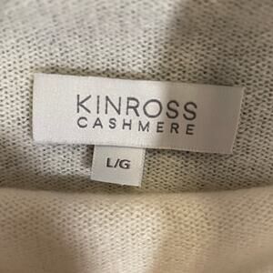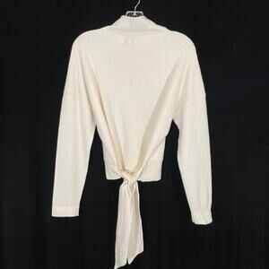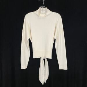 Ivory tie-waist, mock neck, 100% cashmere sweater by Kinross. *Please note the first model pic shows the sweater in a different color - mine is true ivory. Tie at waist can be tied around the front or the back. Excellent pre-owned condition. Bust across the front area measures approx. 22.5 inches.
