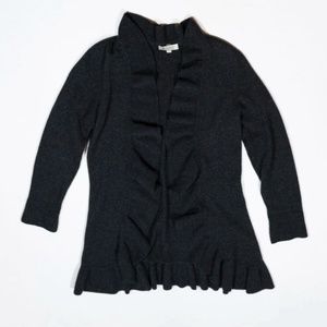 Kinross 100% Cashmere Knit Stretch Open Front Ruffle Trim Cardigan Sweater - Charcoal Gray Heather