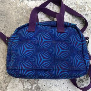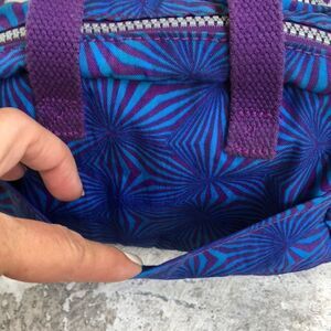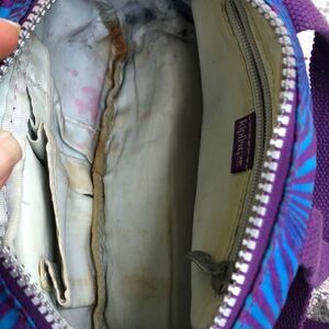 This purple and blue small bag is perfect on the outside, two little front zip pockets are clean inside also has the slip to be able to slide over a roller carry-on. Inside the main bag is not clean. Could possibly come out with stain remover. Please look at the pictures. No longer has the monkey. Measures approximately 8x5x4
