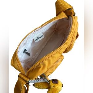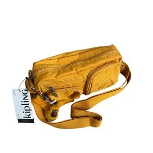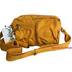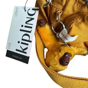 NWT Kipling Albena Crossbody Bag. Designer Color. Spicy Gold. Multi Pockets. 1 Interior Zip Pocket, 1 Interior Slip Pocket. 1 Back Pocket 3 Front Zip Pockets. Zip Closure. W-10.5" x H-7". 58.5" Strap Fully Extended. Monkey Key Chain Bag Charm.