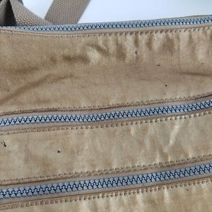 Kipling Alvar Cross Body Gold nylon organizer shoulder bag purse Old worn used this was used as a make up bag and has traveled the world. see pics for defects has slight peeling small spots on bag, inner pockets have make up stains (Bronzer), missing key chain ape/monkey