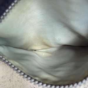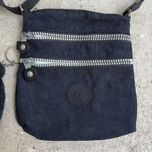 Navy blue small bag that needs cleaning on the inside. Just throw it in the wash. Measure seven by almost 8.