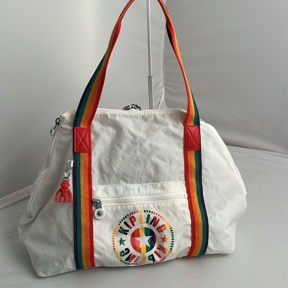 Kipling Art Medium Pride alabaster white multicolor logo rainbow strap tote bag