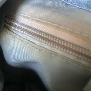 In pre-owned condition with signs of use. There is a small mark on the front exterior. On the interior there are some markings (pen ?) and coloring around the zipper. I captured what I could in the last photos of the listing.