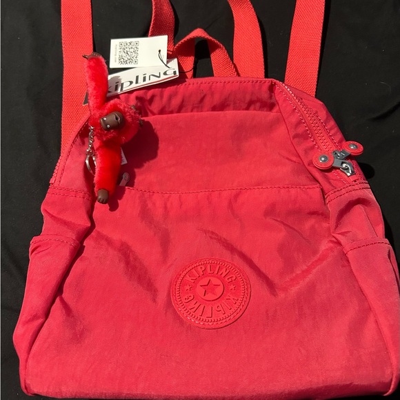 Vibrant cherry red backpack by Kipling. Features playful monkey charm. Ideal for daily adventures.