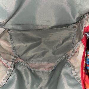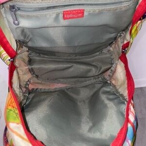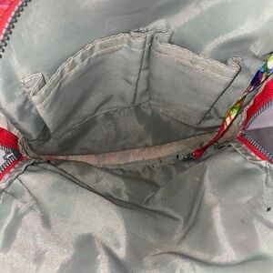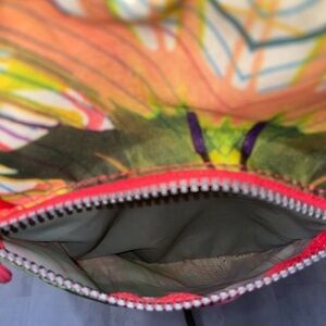 Vibrant backpack with a colorful pattern. Features a mix of pink, green, and orange hues. Stylish and functional for everyday use. Smokefree&petfreehome