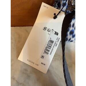 New Kipling Curious Leopard Print Crossbody Bag in Blue print. Features zippered top with 3 separate pockets and exterior slip pocket. Features Metal Louise the monkey. 100% polyester