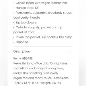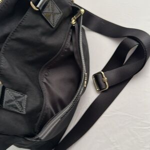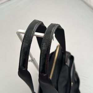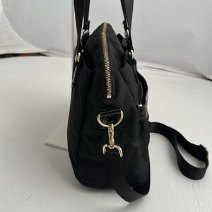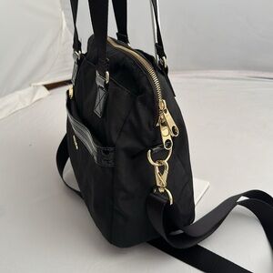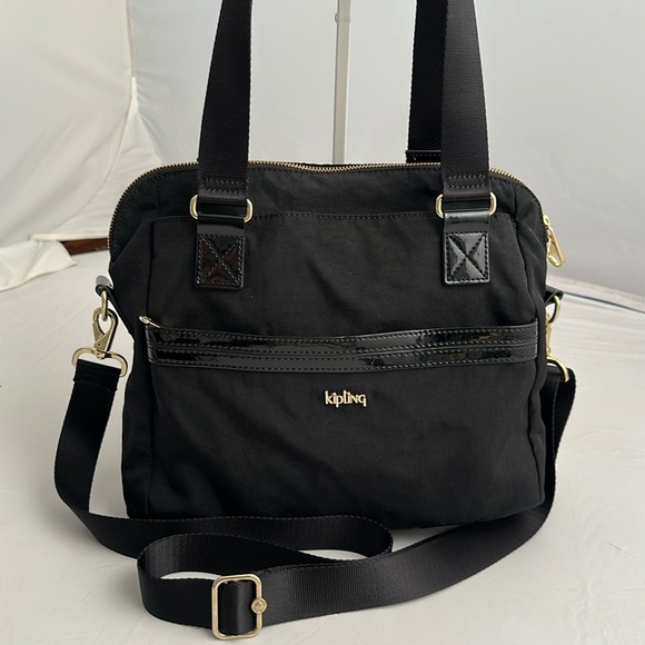 Kipling Dolan black nylon convertible crossbody handbag with vegan patent leather trim. Essential chic carry-all style with removable adjustable crossbody strap. Featuring dual 10” drop handles. Exterior snap pockets and zip pocket. Interior zip and slip pockets. Interior key clip. Polished gold brass hardware and logo. Embossed logo zipper pulls. Exceptional versatility that can go from the office to evening. Excellent condition. Smoke free home. Sold out style.