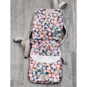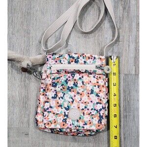 The Kipling El Dorado Flowered Crossbody Bag is a small square-shaped bag with a floral pattern in multiple colors. It features a zip and Velcro closure, a beige crossbody strap, and silver hardware. Made from nylon with a white lining, this bag is part of the Kipling El Dorado product line and includes pockets for added functionality. With a stylish design and practical features, this crossbody bag is perfect for women looking for a trendy yet functional accessory to carry their essentials.