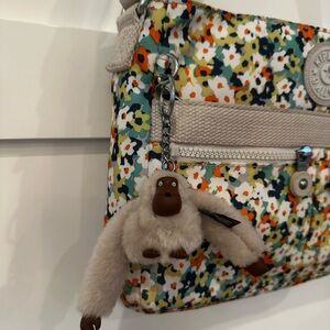Chic Kipling bag featuring a floral pattern. Includes adjustable gray strap and signature charm.