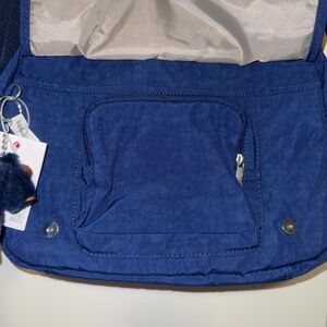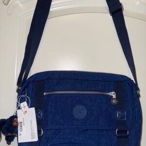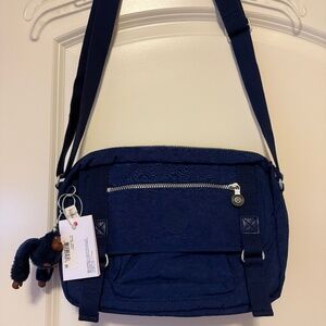 Kipling brand-new Gracy crossbody bag with tags in the color Ink Blue (navy color). This is an excellent bag for travel or just light weight carry. This crossbody has a zipper top closure along with an inside back wall zipper and two inside front wall slip pockets. There is also additional organization on the outside front of the handbag. The front has a zippered front flap once lifted opens to a covered zippered pouch as well as a hidden slip pocket which runs the length of the bag. This bag is perfect to stay organized as there is a compartment for most everything. The measurements of the bag are approximately: L 11", W 3"-3.5", and H 9".
