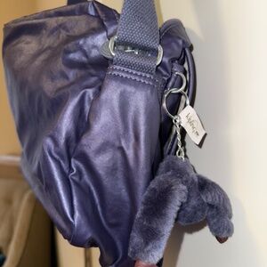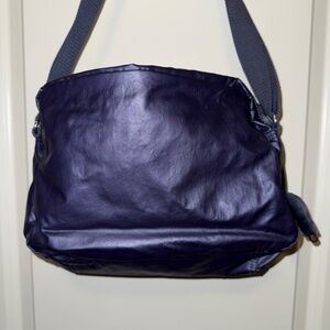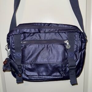 Kipling Gracy crossbody bag in EUC in an iridescent purplish blue color. This is an excellent bag for travel or just light weight carry. This crossbody has a zipper top closure along with an inside back wall zipper and two inside front wall slip pockets. There is also additional organization on the outside front of the handbag. The front has a zippered front flap once lifted opens to a covered zippered pouch as well as a hidden slip pocket which runs the length of the bag. This bag is perfect to stay organized as there is a compartment for most everything. The measurements of the bag are approximately: L 11", W 3"-3.5", and H 9". Due to the iridescent coloring the side view photos may be most accurate for coloring.