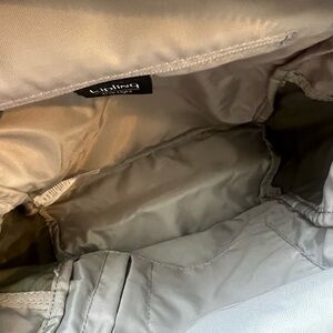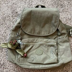 Chic khaki backpack featuring a playful monkey keychain. Ideal for daily adventures.
