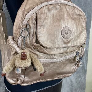 Kipling Matta Up Backpack Travel Bag Polyamide Metallic Gold w Monkey keychain