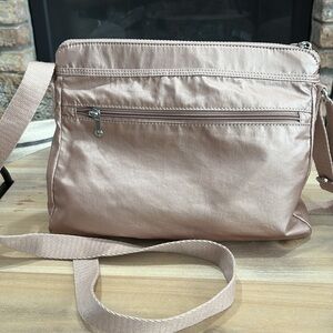 Stylish Kipling crossbody bag. Features a metallic beige finish. Compact and versatile design. Ideal for everyday use.
