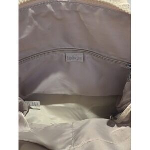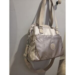 Stylish metallic crossbody bag. Features dual handles and adjustable strap. Iconic Kipling logo on front. No monkey