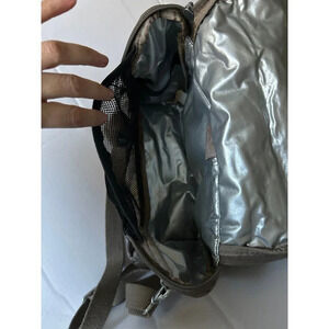 metallic insulated lunch bag. Adjustable crossbody strap has an elastic inside to hold onto a water bottle Comes with the Kipling monkey.