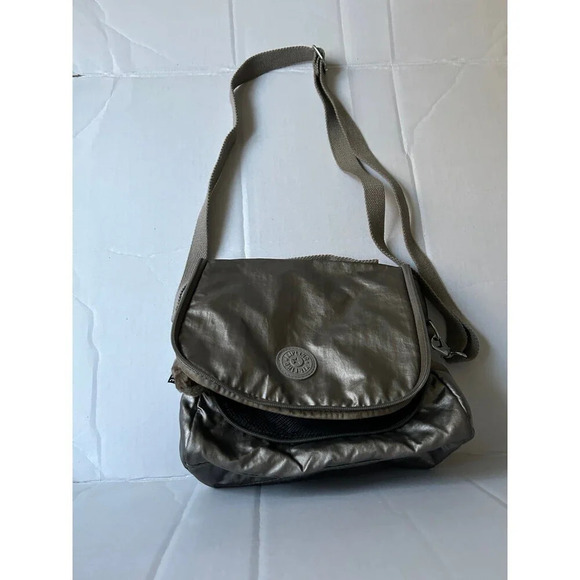 metallic insulated lunch bag. Adjustable crossbody strap has an elastic inside to hold onto a water bottle Comes with the Kipling monkey.
