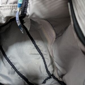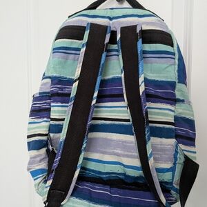 Chic backpack with multicolor stripes. Ideal for daily adventures. Side pockets, no stains or defects, used a few times. Fits a laptop but it doesn't have the compartment for it.