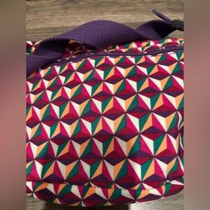 Vibrant crossbody bag with a geometric pattern. Features a purple adjustable strap and secure zip closure.
