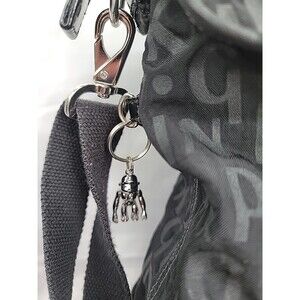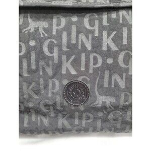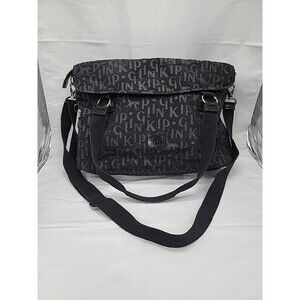 This is a Kipling Nylon Messenger Bag in black, featuring an allover spellout pattern with a rectangular shape. It has a zip and magnetic closure, a crossbody strap in black, and silver hardware accents. The bag is large in size with a polyester lining in gray. It includes inner pockets, an adjustable strap, and pockets for organization. The design is classic and colorful, suitable for travel or casual occasions. There is a bit of dirt on the inside of top flap. I have not washed.