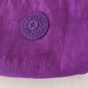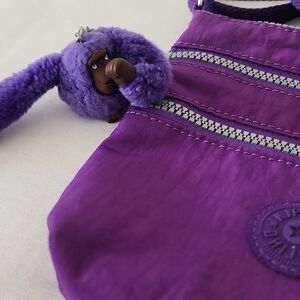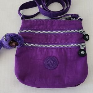 Stylish Kipling crossbody bag. Features vibrant purple color. Includes signature monkey keychain. Multiple zippered compartments. I purchased it for work but they changed our theme colors so no longer needed it.