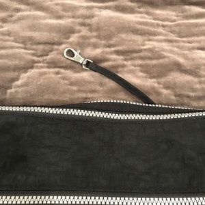 Black bag with multiple zippered sections - clean and in good used condition - does not come with monkey fob (sorry). Does have one stain on interior see it in the picture.