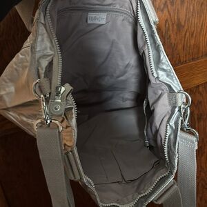 17”w x 12”l metallic silver purse with short straps and long strap that clips offs. Has top zipper closure. Never used brand new condition