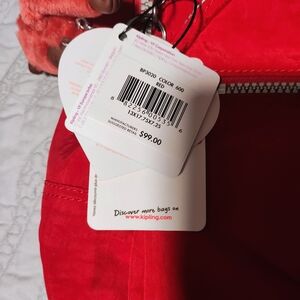 Vibrant red Kipling backpack. Features multiple zippered compartments. Iconic logo on front.