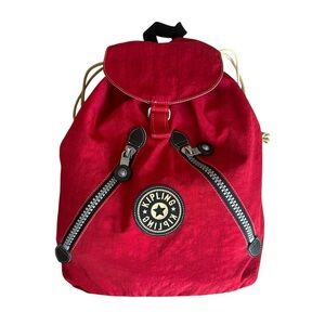 Pre-owned Vintage vibrant Red Kipling Backpack with drawstring closure. Features adjustable straps and signature logo patch. Silver Hardware. 2 Front Zip Pockets. Black stain on bottom of the bag more noticeable inside than outside pointed out in last 2 pics. W-15” x H-15.5” x D-6”.