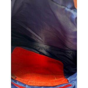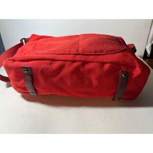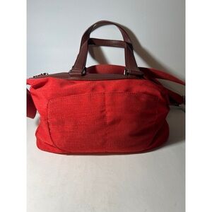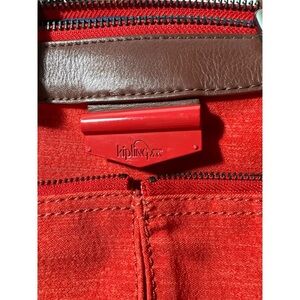 Stylish red duffel bag by Kipling. Features dual handles and a shoulder strap. Front zip pocket for easy access.