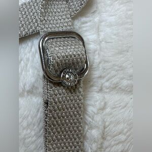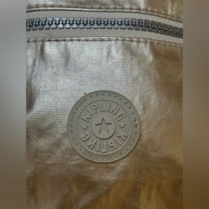 Elegant Kipling bag with a shimmering silver tone. Features a signature logo patch.