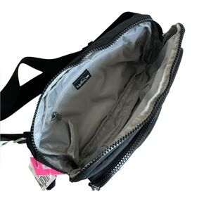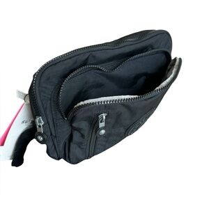 NWT Kipling Belt Bag / Sling Bag. Can be worn either way. Size Large W-11” x H-7”x D-3”. Designers Color is Black. Features: signature monkey keychain, 2 Main Compartments with Zip Closure. Front Zip Pocket. Grey polyester lined interior. 2 Slip Pockets and 1 Zip Pocket. Adjustable Cotton Canvas Belt can extend up to 52”. Shown on Size S/M for Size Reference.