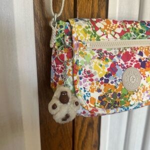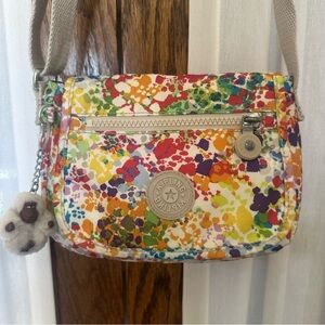 Kipling Watercolor Sabian Convertible Crossbody Bag. A lightweight and super roomy convertible crossbody bag that hold so much. In a pretty all over watercolor print of pink, purple, green, yellow, tan and teal on white. Trimmed in neutral beige tan. Front, Velcro-close flap with logo pull zipper pocket on the exterior. Large interior compartment with zipper pocket and attached key fob clip. An adjustable strap to wear on your shoulder or crossbody. And of course, a coordinating gorilla keychain. Great condition with some light inside markings. Pet and smoke free home.