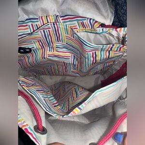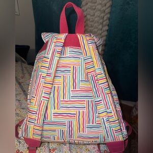 Multicolor backpack inside have 3 compartments. Out side have a pocket with zipper. Like new.