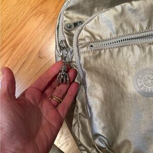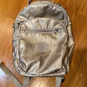 Kipling backpack in metallic silver. Front zip pocket and adjustable straps. iPad pocket inside