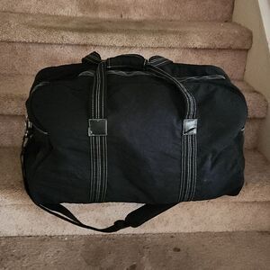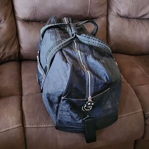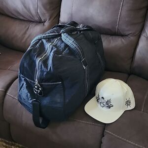 Large Kipling duffle bag measures about 22"×12"×11" with newer shoulder strap. Black with white accent trim. It has one zippered inner compartment. Hat not included.