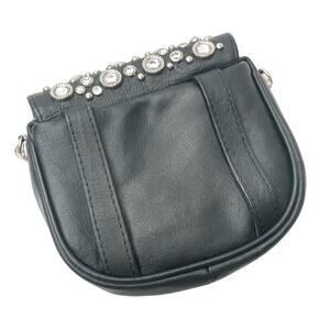 This statement mini crossbody purse is guaranteed to get you attention. Swarovski crystal rhinestone embellished, bold stitch embroidered, small leather overlay. Versatile design can be worn crossbody or worn on you belt.