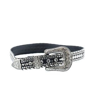 Size Small – Black leather with red accents + sparkling rhinestones. Features a bold decorative buckle and adjustable fit for comfort. True Western glam with vintage-inspired cowgirl vibes. Perfect statement piece to add bling + edge to any outfit.
