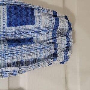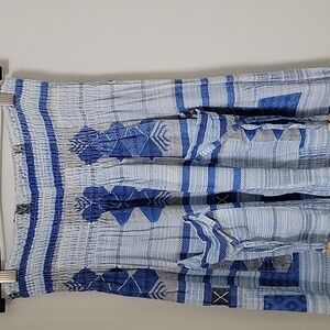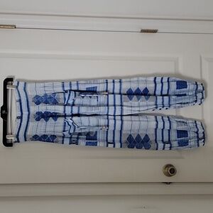 Kirat International Blue & White Patterned Hippie / Harem Pants, Size Unknown. 100% Cotton, Front Thigh Pockets with Beaded Tie Detail. Elasticized Ankles. Smocked Wide Waistband. Please refer to measurements in photos to ensure proper fit.