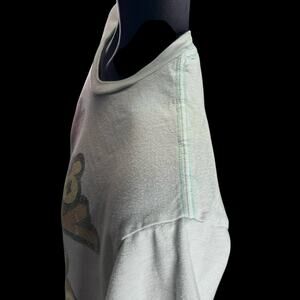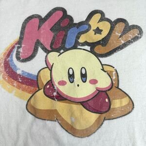 Official Nintendo × HAL Laboratory Kirby T-shirt, featuring a vintage-style rainbow and star graphic of Kirby flying across the front. This men’s size Large tee is made from 100% cotton and crafted in Mexico, offering a soft, worn-in feel that gives off the perfect retro gamer aesthetic.
