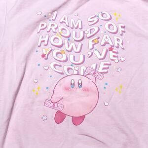 Introducing a Kirby “I’m So Proud of How Far You've Come” sweater for men in size medium, pink color, featuring a pullover hoodie design. This sweater is used and in good condition.