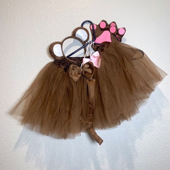 - Cute kids costume set of tutu with elastic waist, ears with headband, bow tie, paw gloves, and tail. Could either be a bear or a dog.